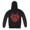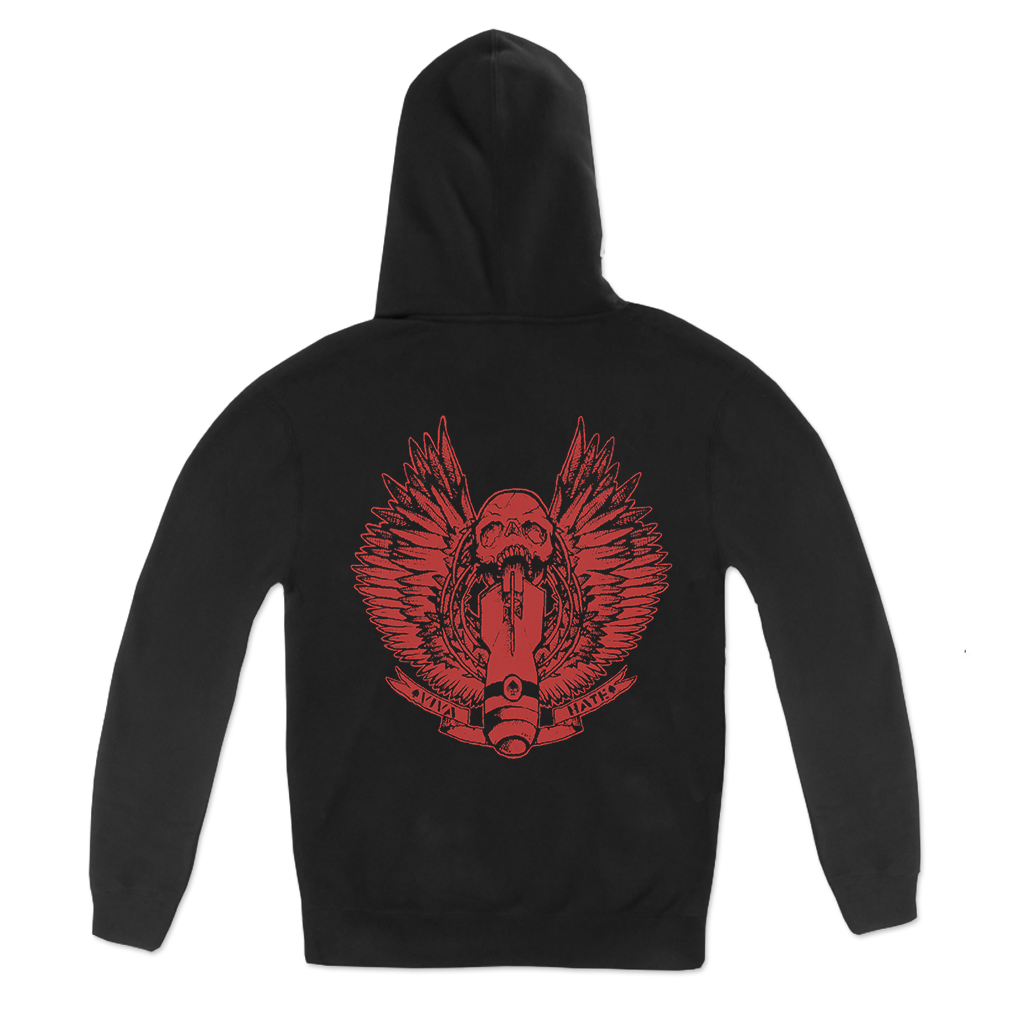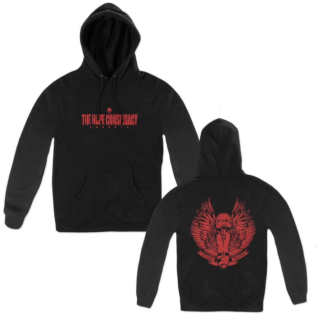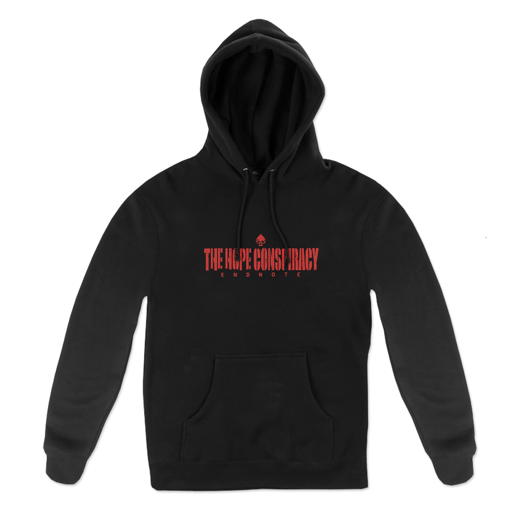 The Hope Conspiracy's "Endnote" design, printed on the front and back of a black Independent Trading Co. pullover hooded sweatshirt.