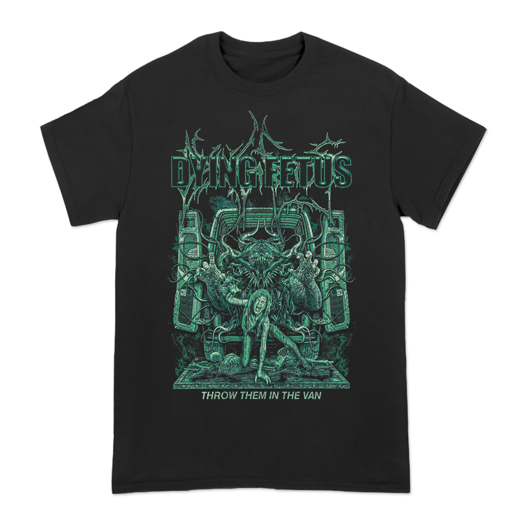 Dying Fetus's "Throw Them In The Van" design, printed on the front and back of a black Gildan tee.