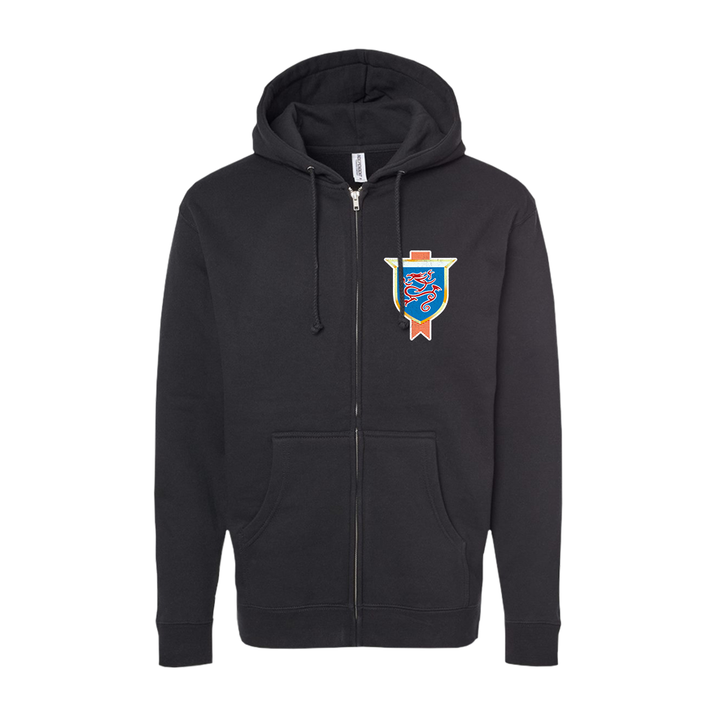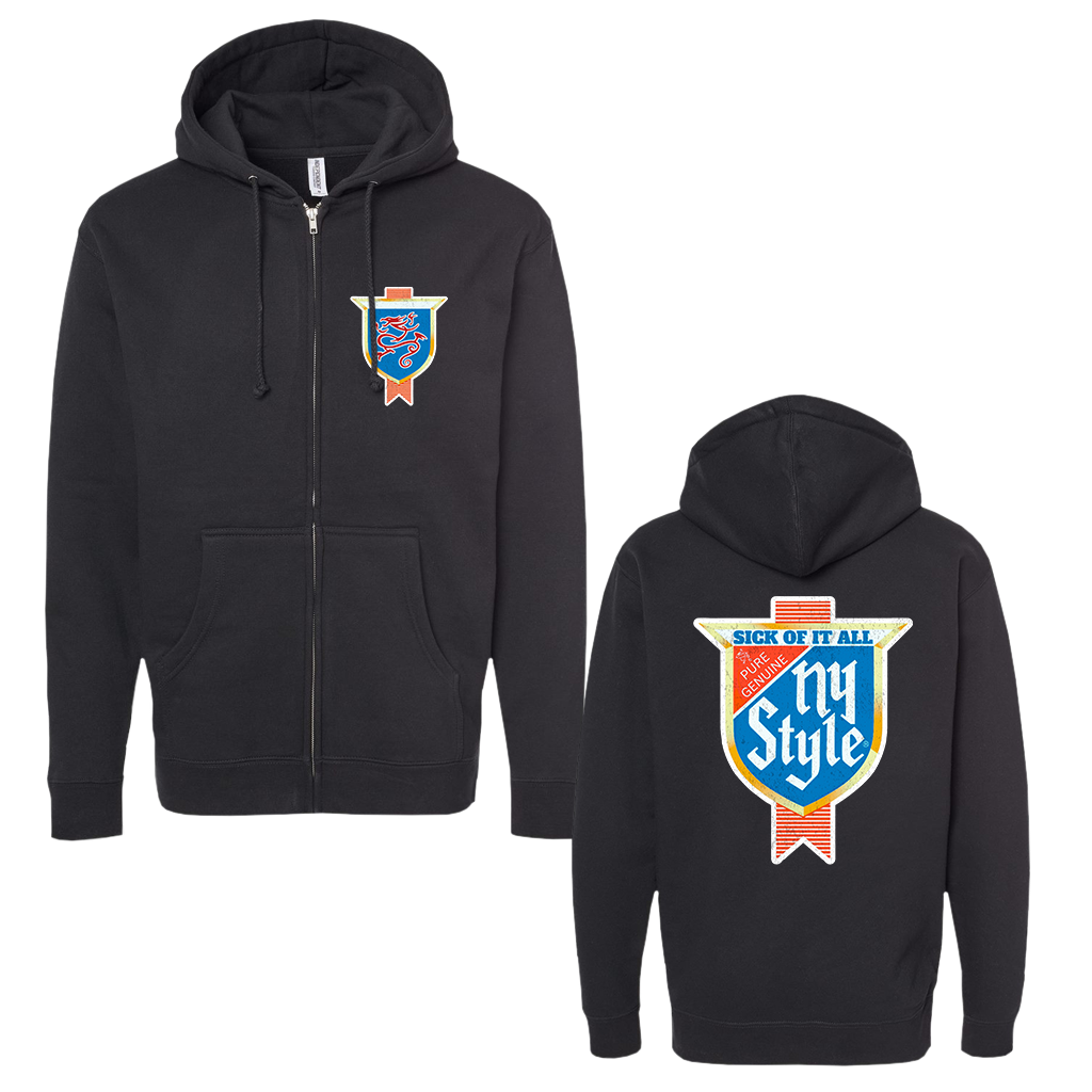 Sick Of It All's "Pure Genuine Badge" design, printed on the left chest and back of a black Independent Trading Co. zip hooded sweatshirt.