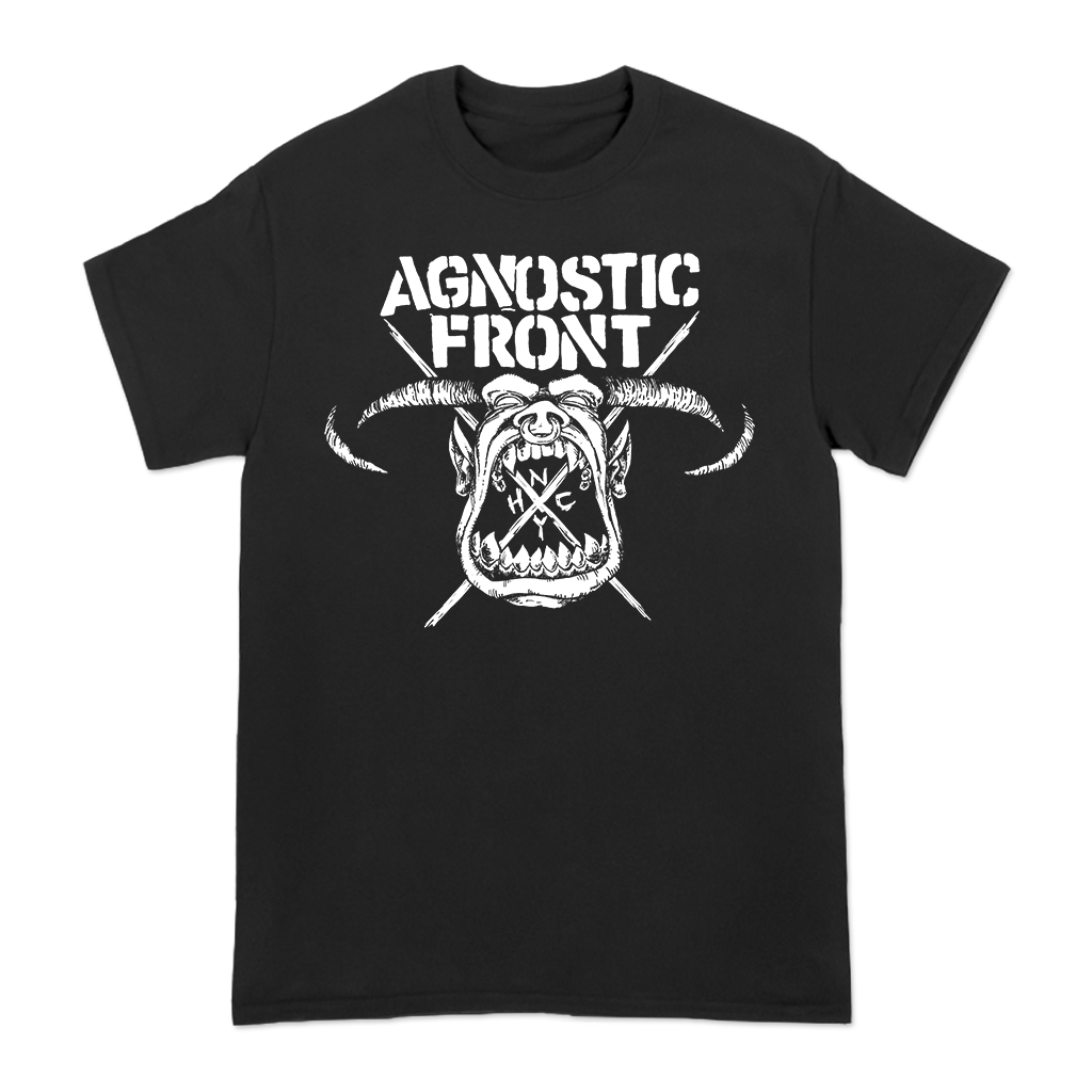 Agnostic Front's "Eliminator Face" design, printed on the front of a black Gildan brand tee.