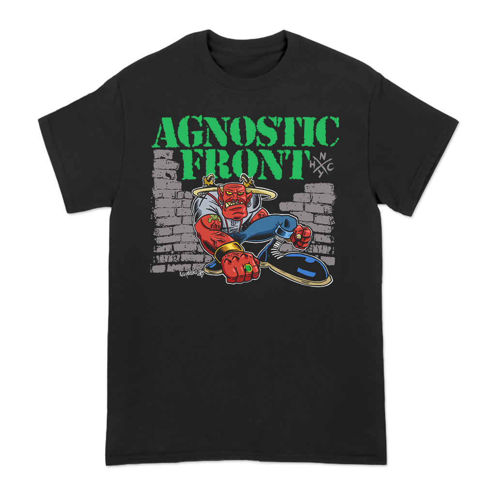 Agnostic Front's "Lambrou Beast" design, printed on the front of a black Gildan brand tee.