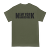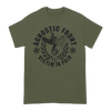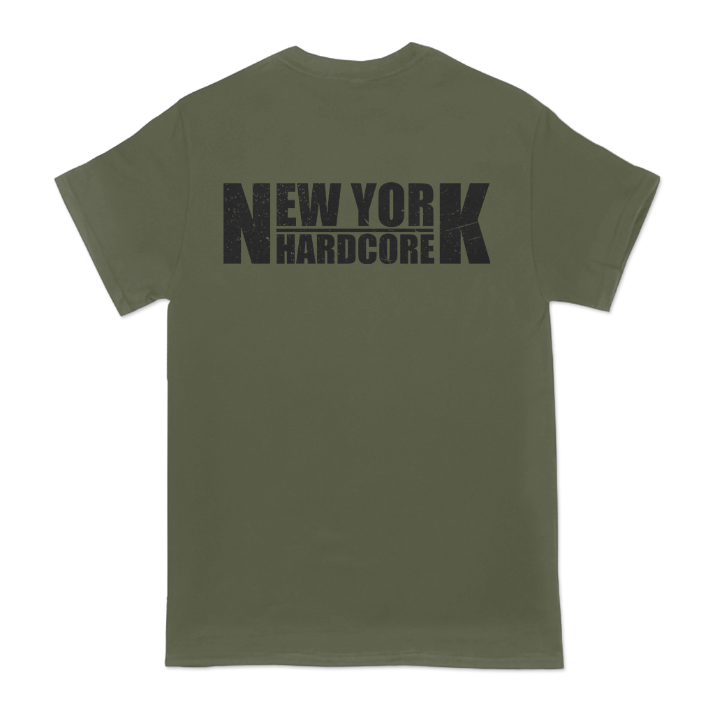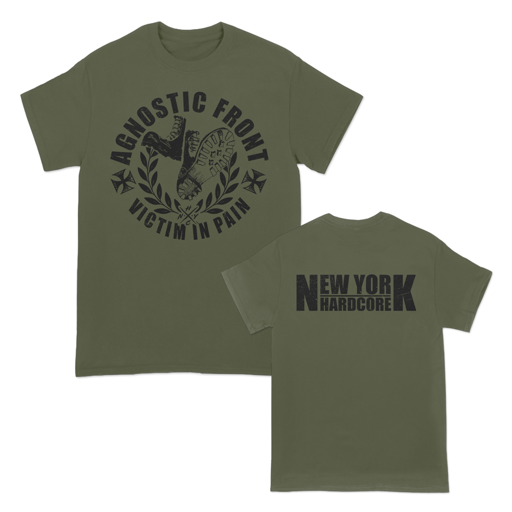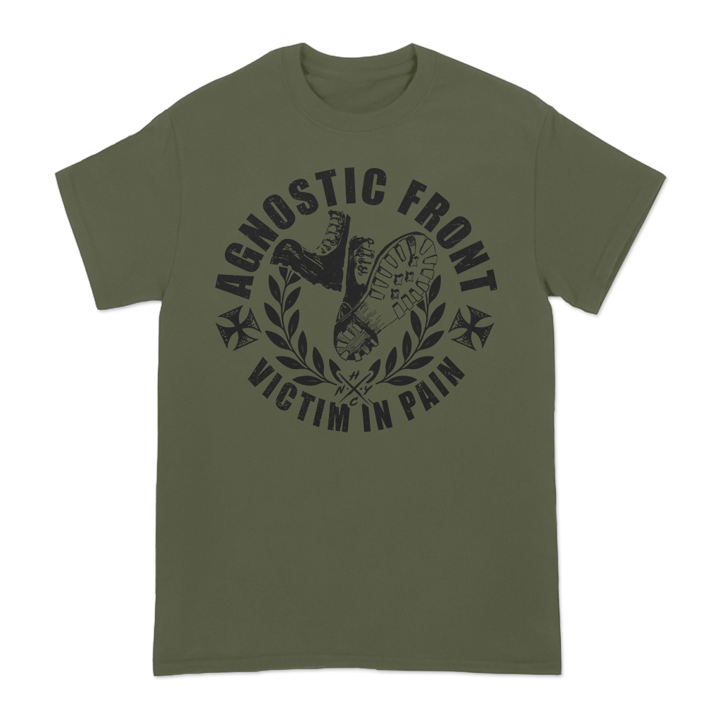 Agnostic Front's "VIP Boots" design, printed on the front and back of a Military Green Tultex brand tee.