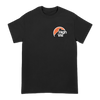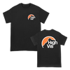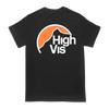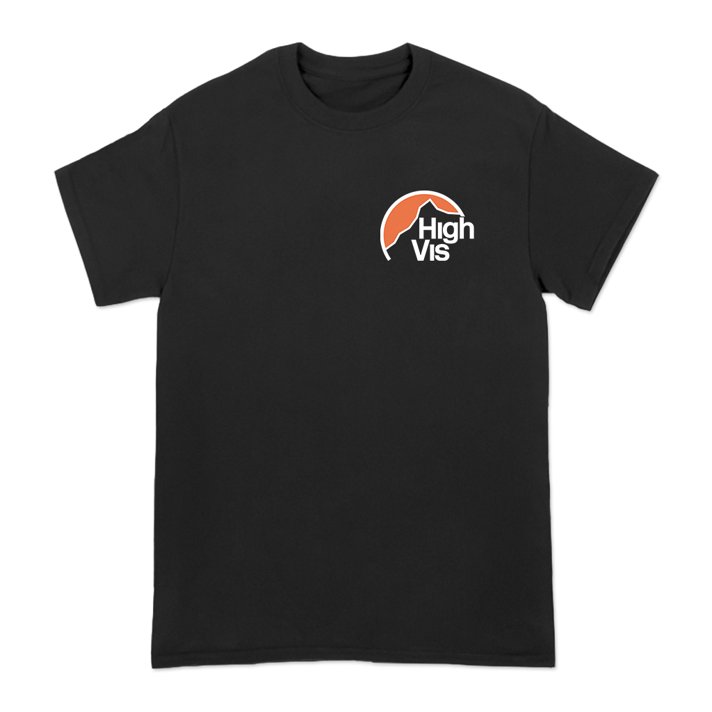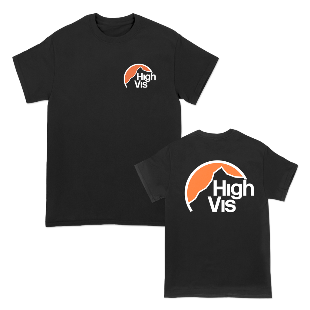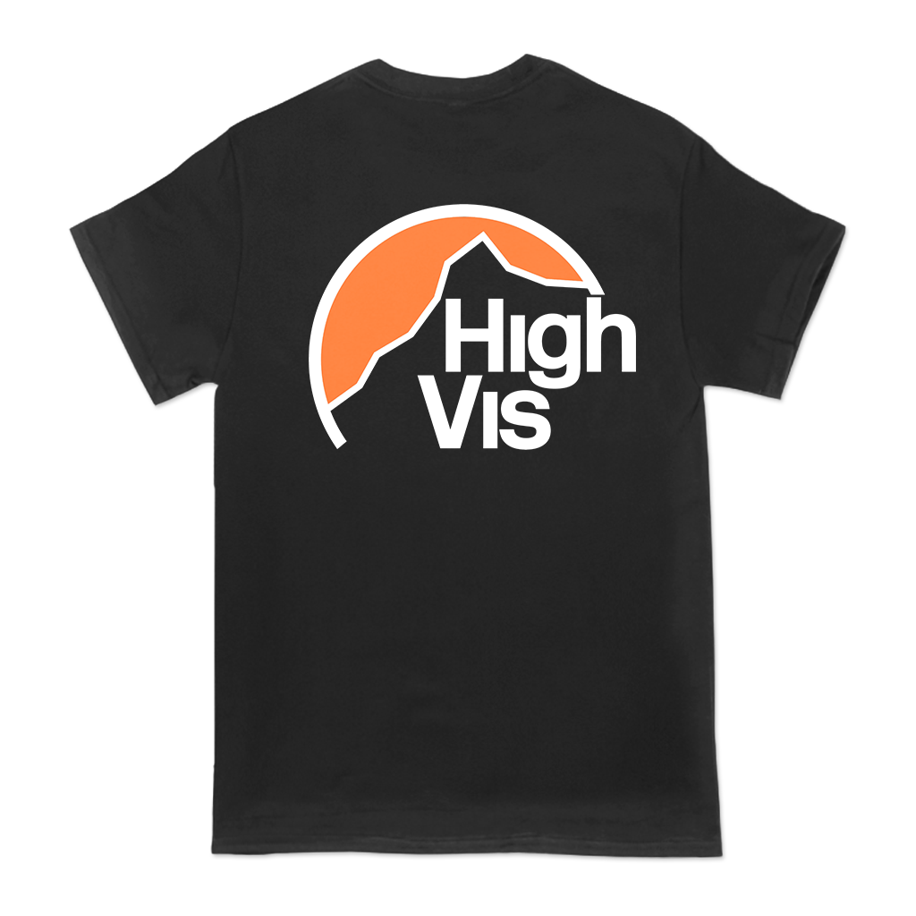 High Vis's "Mountain" design, printed on the front and back of a black Gildan Hammer tee.