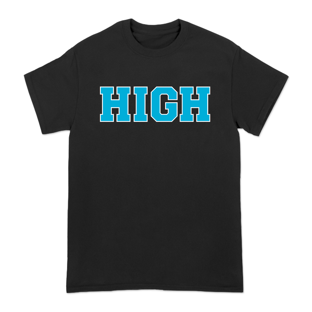 High Vis's "Varsity Puff" design, printed on the front and one sleeve of a black Gildan Hammer tee.