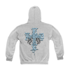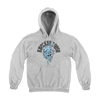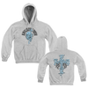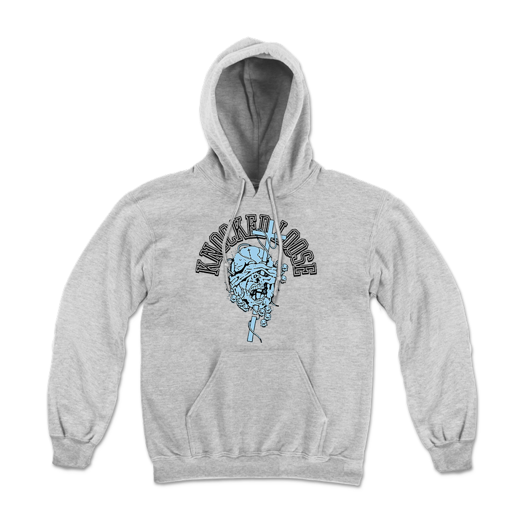 Knocked Loose's "OTAK" design, printed on the front and back of an ash Champion brand pullover hooded sweatshirt.
