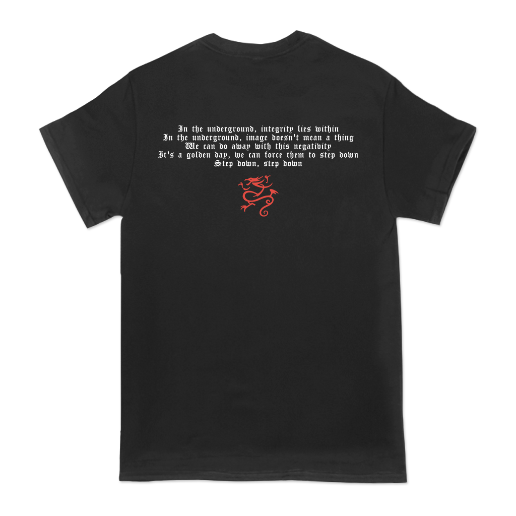 Sick Of It All's "Step Down Live" design, printed on the front and back of a black Gildan Apparel tee.