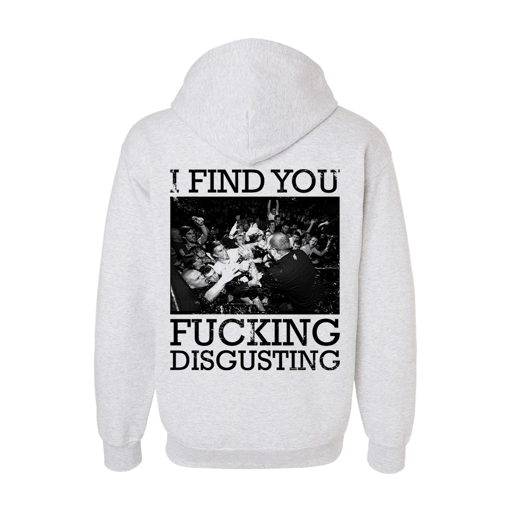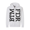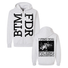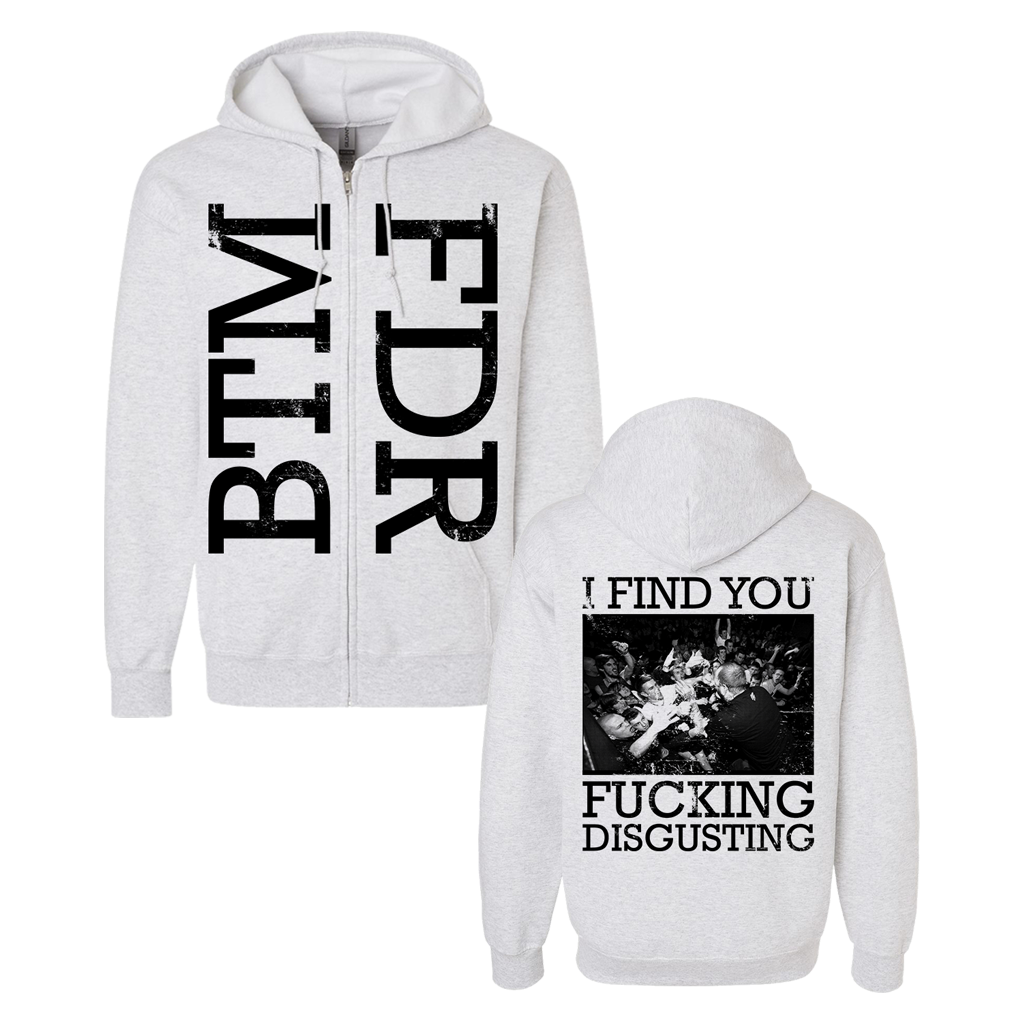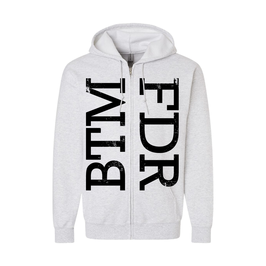 The Acacia Strain's "BTM FDR" design, printed on the front and back of a silver grey Champion brand zip hood sweatshirt.